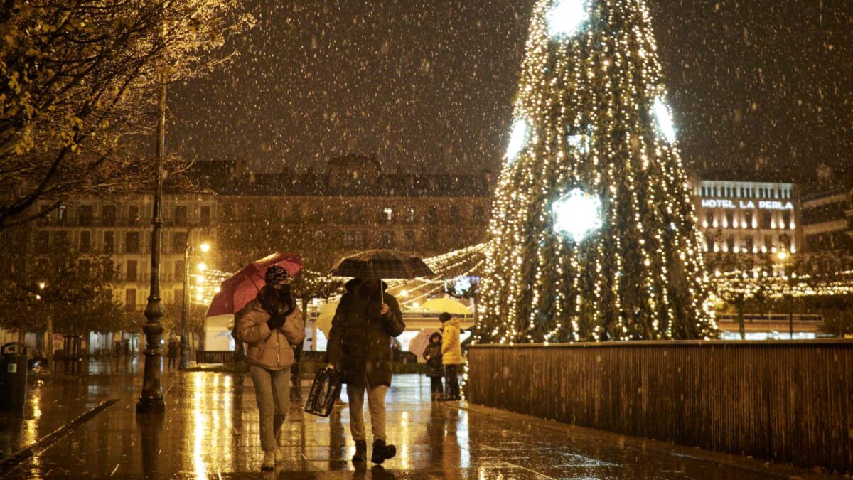 Dos personas caminan bajo la nieve en Pamplona. | Eduardo Sanz (Europa Press)