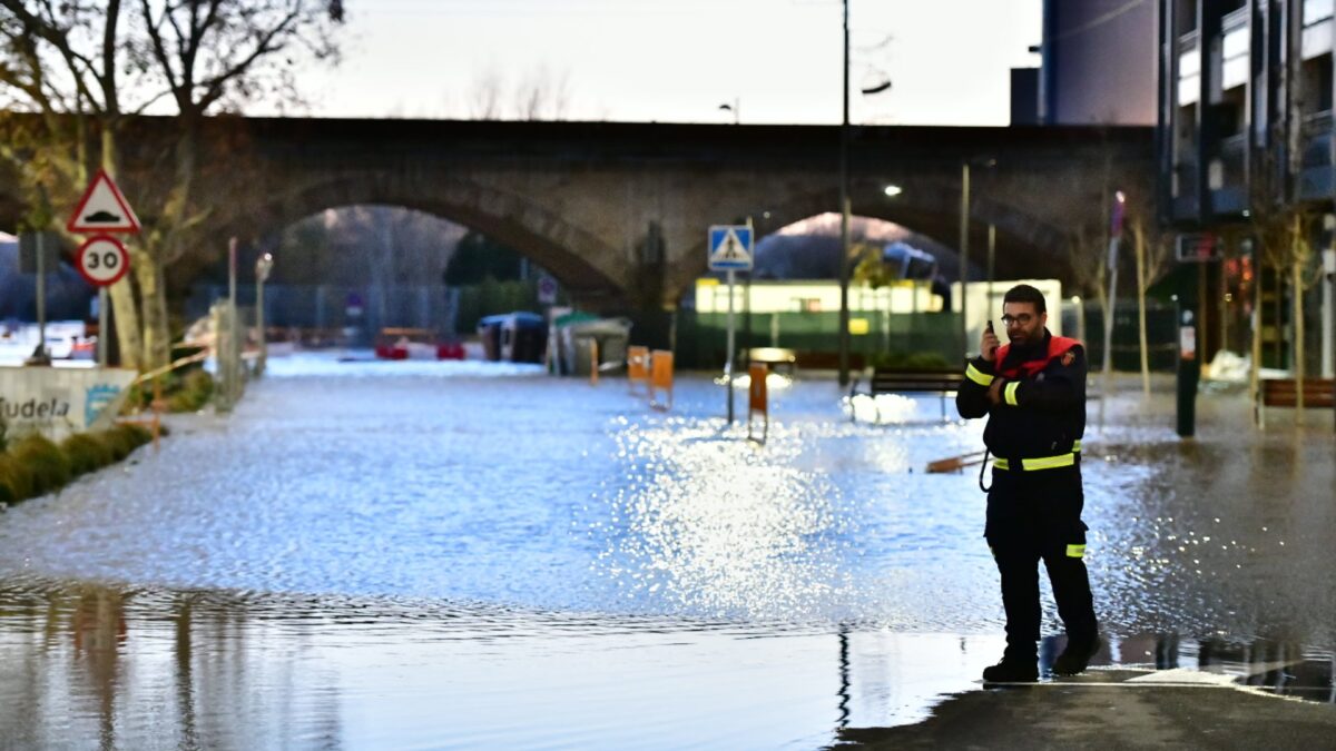 Calle inundada por la crecida del Ebro en Tudela. | Iván Delgado (Europa Press)