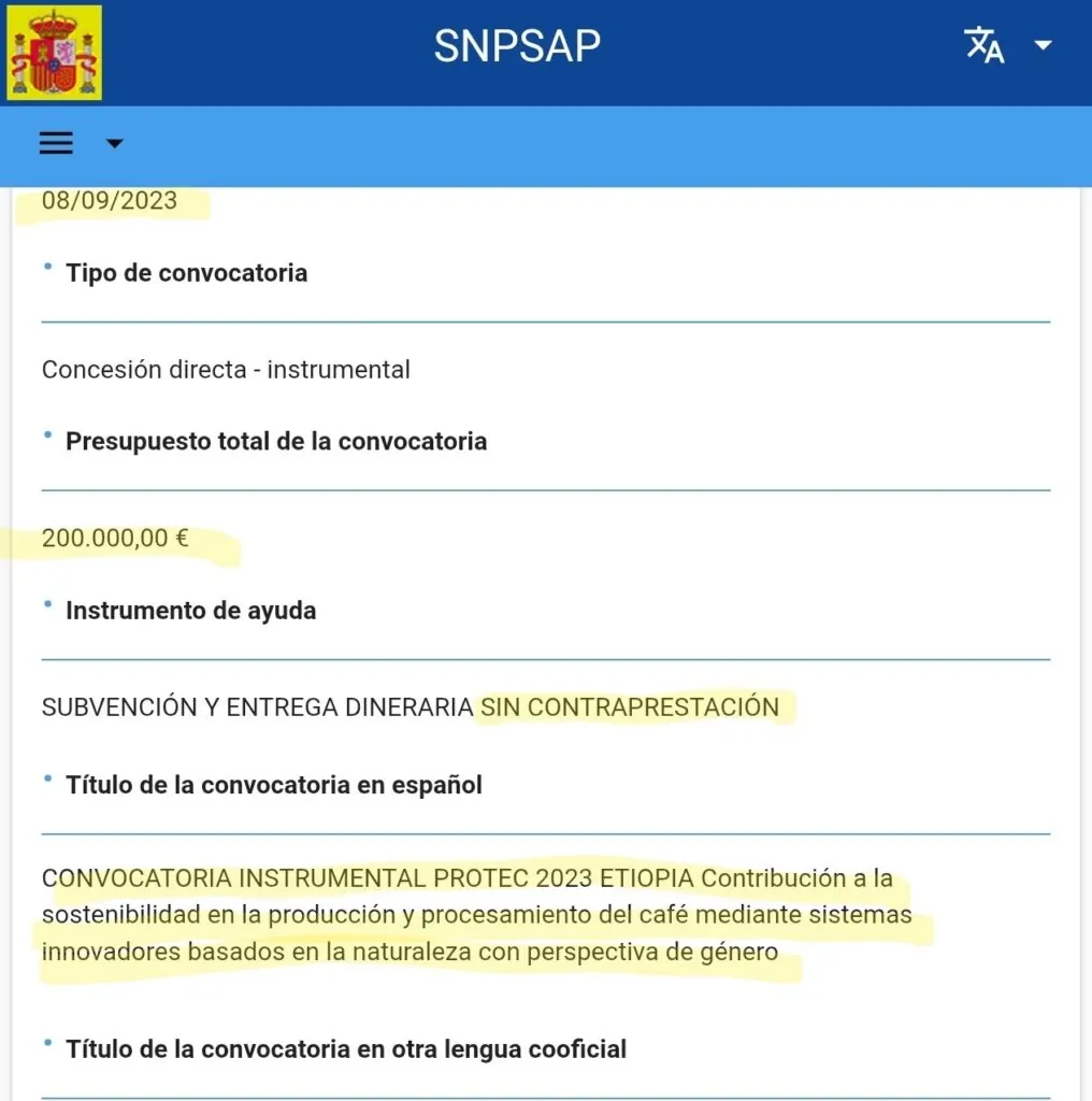 - 200.000 euros: «CONVOCATORIA INSTRUMENTAL PROTEC 2023 ETIOPIA Contribución a la sostenibilidad en la producción y procesamiento del café mediante sistemas innovadores basados en la naturaleza con perspectiva de género».