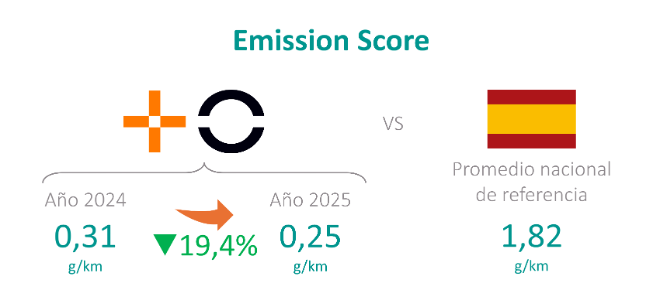 En concreto, el índice Emission Score de la flota de MasOrange se sitúa en 0,25 g/km, lo que supone una mejora de casi el 20% respecto a las mediciones obtenidas en 2024, y es un 86% inferior al promedio de vehículos en circulación en ciudades españolas (1,82 g/km).