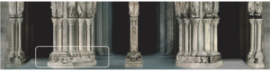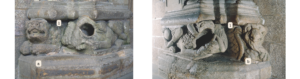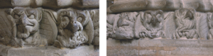 En muchas construcciones de la época se utilizan imágenes contrapuestas que simbolizan el bien y el mal, situadas en los arcos de entradas o ventanales. En el Pórtico y en ambas esquinas, se ilustra esta lucha y su resultado. Son dos escenas similares con tres imágenes: un león, un hombre mayor -1- que intenta dominarlo y un tercer animal que completa la escena y que explica el desenlace.