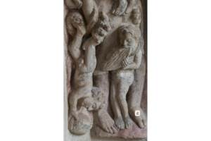 En la escena interior de la derecha las almas que están en poder de los demonios. En -a- un monstruo arrodillado sujeta, con sus garras y con su rabo, a un hombre y a una mujer a quienes devora la mano derecha en alusión a los ladrones y avaros. En -b- el demonio castiga a los violentos: Cuatro pecadores están como inmovilizados, las manos atadas por la espalda y con una soga al cuello.