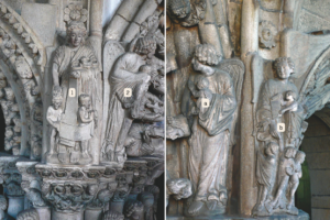 Son “justos” del pueblo elegido y por eso llevan coronas. En la arquivolta inferior, las tres figuras centrales escenifican la Creación: El Verbo, está entre Adán y Eva (señalado con una flecha en la imagen). Es un Cristo joven sin barba, al comienzo de la Historia, sonríe. No tiene el aura, pero tiene corona. Es un Cristo Pantocrator, bendice con su mano derecha mientras en la izquierda sostiene el libro de la ley. Eva a la derecha muestra una actitud temerosa.