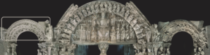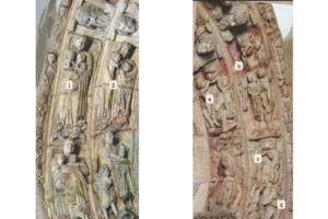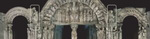 La tradición llama “el Purgatorio” a este arco de la derecha con tres arquivoltas. En la estrecha franja superior, encontramos dos filas de seis personajes cada una. Parecen fuera de lugar porque aún están vivos. Indican que el hombre, durante su tiempo en la tierra, puede caminar hacia destinos opuestos. Las imágenes señalan las consecuencias de cada elección.