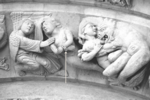 Saint Denis: Un alma encadenada por las manos es salvada de los apresados por el demonio y llevada por un ángel ante Cristo.