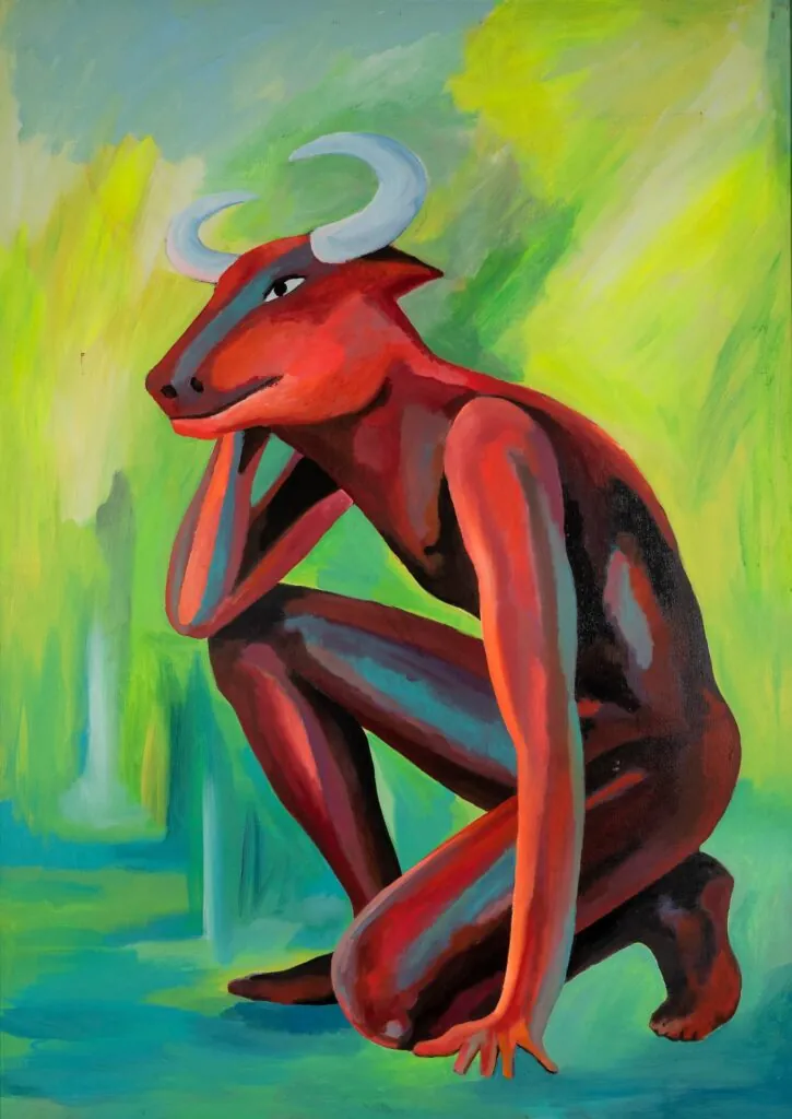 Las obras seleccionadas para esta muestra enfatizan la estética folclórica y camp a través de una serie de animales mitológicos que hilan la búsqueda artística del dúo. No son referencias taurinas, como a veces se ha supuesto. «Son animales imaginarios, cabras faraónicas, metafóricas, más mitológicos que taurinos», explica Serrano al señalar la pieza Hombre pájaro (1985) o Minotauro pensante (1985) expuestas en Imago Dei. Estas figuras no solo funcionan como metáforas del cuerpo queer: cuerpos transformables, híbridos, casi teatrales. Son parte de la lectura contemporánea que da a entender la obra de Costus, y en especial de Juan de O., no como reflejo de la Movida madrileña, sino como exploración de identidades que hoy día siguen en disputa.