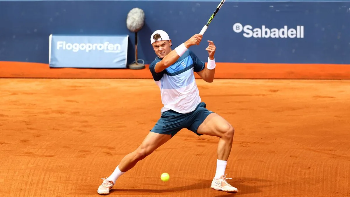 Rune lanzando una derecha en la final contra Alcaraz en el Trofeo Conde de Godó