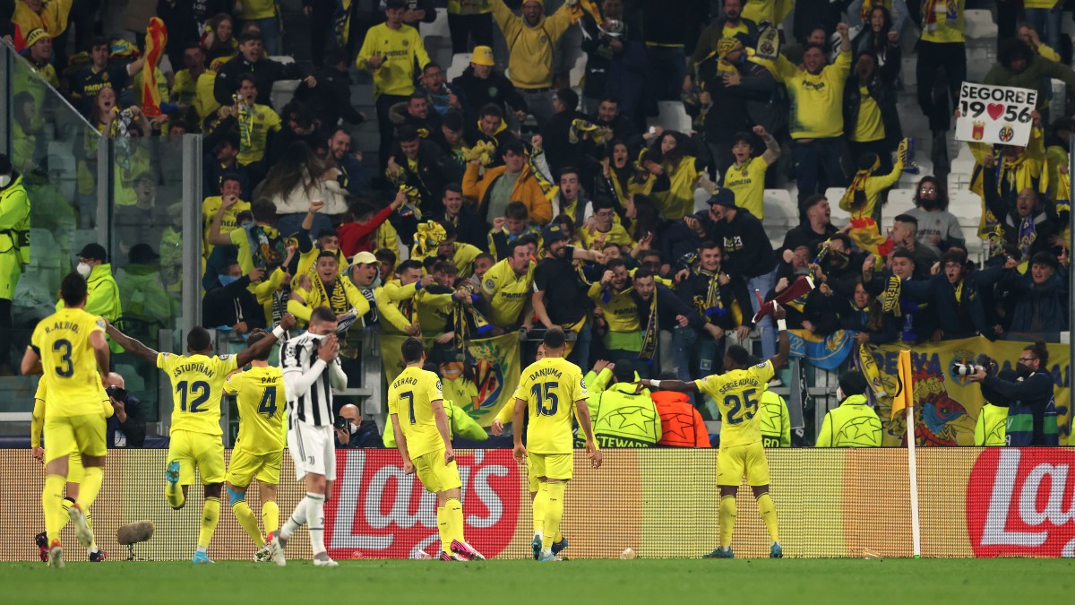 Jugadores del Villarreal celebran su victoria ante la Juventus junto a sus aficionados. | Jonathan Moscrop (Zuma Press)