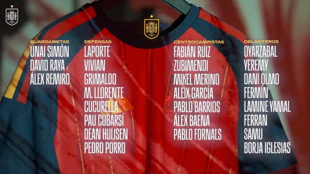 - Atacantes: Lamine Yamal, Ferran Torres, Dani Olmo y Fermín López (FC Barcelona), Yéremi Pino (Crystal Palace), Mikel Oyarzabal (Real Sociedad), Samu Aghehowa (Oporto) y Borja Iglesias (RC Celta).