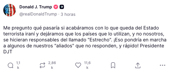 «Me pregunto qué pasaría si ‘acabáramos’ con lo que queda del Estado terrorista iraní y dejáramos que los países que lo usan, nosotros no, se hicieran responsables del llamado ‘estrecho’. Eso haría que algunos de nuestros ‘aliados’ que no responden se pusieran las pilas, ¡y rápido!», escribió en su red Truth Social.