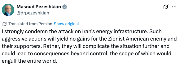 Irán ha asegurado de que los ataques a su infraestructura energética pueden acarrear «consecuencias incontrolables» que complicarán aún más la situación y podrían afectar a todo el mundo.