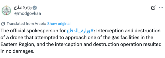 Un dron que se dirigía hacia una instalación de gas fue interceptado en Arabia Saudita