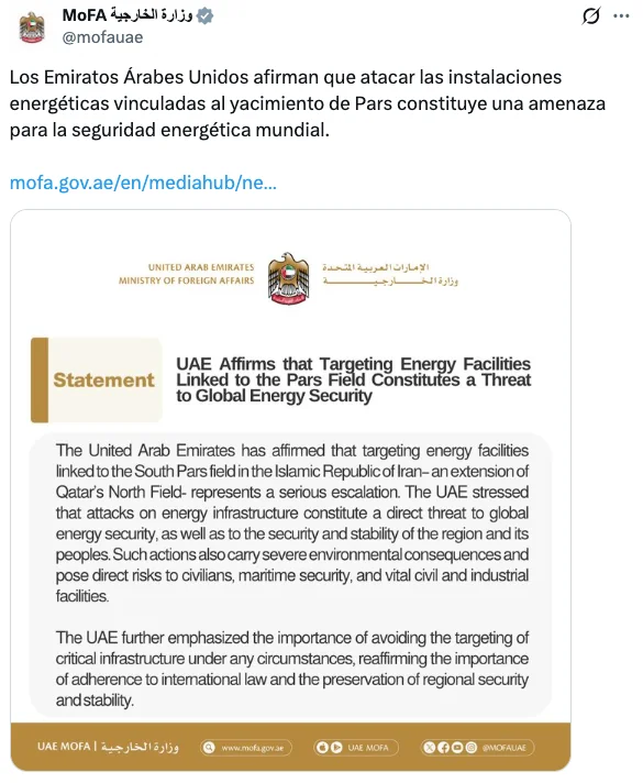 «Irán es capaz de atacar —y podría hacerlo ahora— las instalaciones de petróleo y gas en los Estados del Golfo. Esto podría intensificar la guerra, afectando gravemente a los mercados internacionales y a la capacidad de los Estados del Golfo para exportar petróleo y gas».
