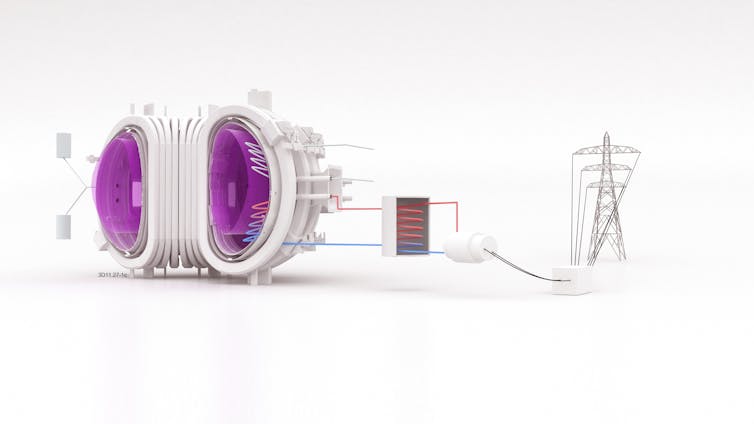 Los neutrones, en cambio, no son confinados por el campo magnético y transfieren su energía a un refrigerante situado inmediatamente después de la pared expuesta al plasma. El refrigerante a su vez la transfiere a un intercambiador de vapor, este a una turbina y esta a un generador, de manera que se produce energía eléctrica.