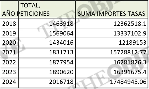 Entre 2018 y 2023 se observa un ingreso progresivo del total recaudado. En 2018, los ingresos fueron de 12.362.518,1 euros, mientras que en 2024 ascienden a 17.484.945,06 euros, lo que representa un aumento del 41,4% en seis años. Los ingresos son directamente proporcionales al número de peticiones, aunque en 2023 se da una excepción. El motivo de la discrepancia podría deberse a un cambio en las tasas, distintos precios en los tipos de informes (aunque en la web se indica que todos tienen el mismo coste) o incluso un error en la recopilación de datos.