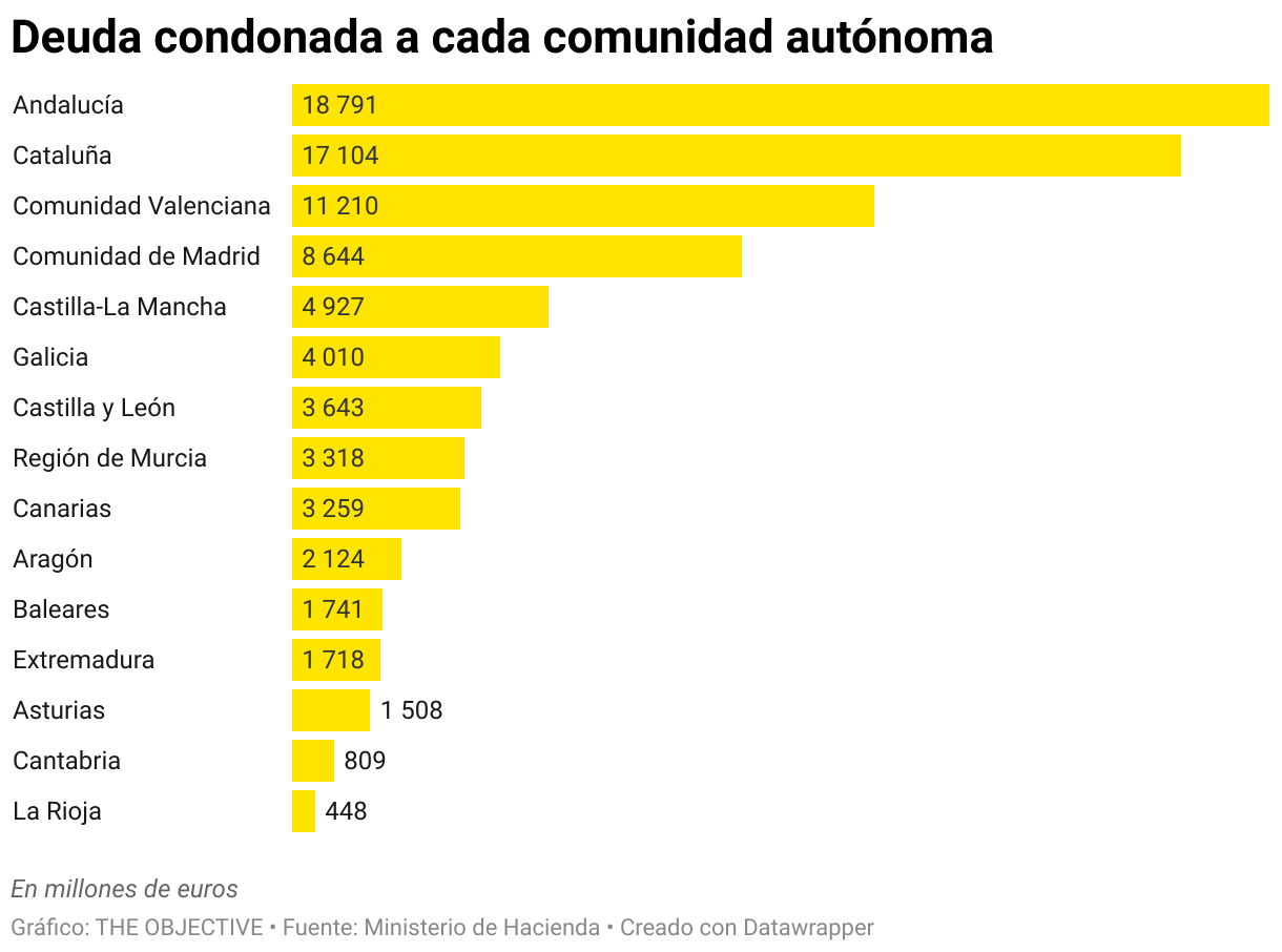 En cualquier caso, Andalucía y Cataluña serían las comunidades autónomas más beneficiadas con esta propuesta, ya que el Estado asumiría 18.791 millones de euros en el caso de la primera y 17.104 millones en el caso de la segunda, acaparando más del 43% del total entre las dos.