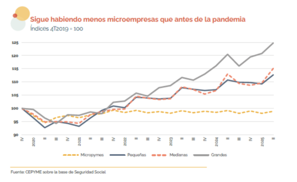 Desde el primer trimestre de 2021 hasta el segundo de 2025 se ha llegado a acumular una diferencia próxima a los seis puntos porcentuales entre el incremento de los costes laborales en las empresas pequeñas (26,8%, incluyendo las microempresas) y las medianas (21,3%). «Una diferencia -sostiene Vidal- que refleja el enorme peso que el incremento de los costes está teniendo para las empresas más pequeñas, en especial para las microempresas, que por su menor dimensión y recursos tienen menos capacidad para afrontar estos fuertes incrementos y ven mermada su capacidad para mantener la actividad».