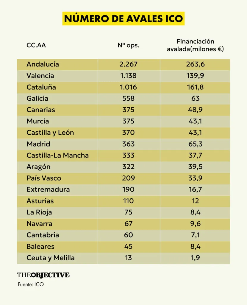 El uso de esta medida por parte de los ciudadanos es muy dispar a nivel regional. Andalucía lidera la concesión de estos avales para primera vivienda con un total de 2.267 operaciones y 263,6 millones de euros financiados, seguida de Valencias con 1.138 operaciones y 139 millones de euros y Cataluña con 1.016 operaciones y 161,8 millones de euros. Sin embargo, llama la atención el caso de Madrid, uno de los lugares con el mercado de vivienda más tensionado pero que menos ha usado esta medida del Gobierno.