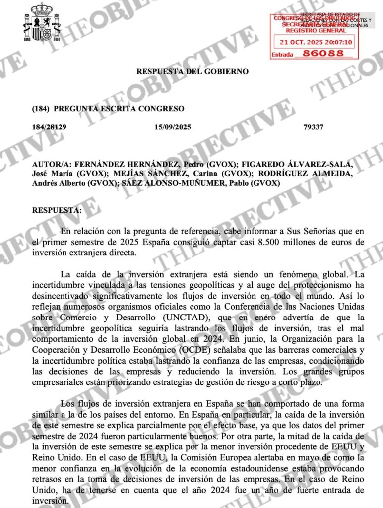 En sus respuestas parlamentarias a Vox, fechadas en septiembre y octubre, el Ejecutivo reconoce el desplome, aunque lo atribuye a factores «externos y transitorios». Pero el discurso oficial, que responsabiliza al contexto internacional, deja sin abordar lo que los analistas y empresarios perciben como el problema de fondo: una pérdida sostenida de confianza en la economía española y su marco regulatorio que no invita a invertir.
