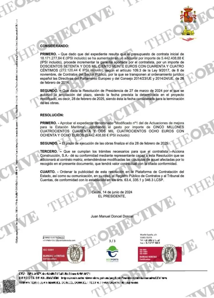 En marzo de 2024, Ineco redactó el proyecto modificado por culpa de los sobrecostes. THE OBJECTIVE ha verificado el documento: el incremento asciende a 5.442.408,88 euros, que elevan el coste total hasta 23.613.686,72 euros. La Oficina de Supervisión de Puertos del Estado emitió un informe favorable respaldando el cambio. Dada su cuantía, el modificado debió elevarse al Consejo de Ministros, que lo aprobó el 11 de junio de 2024. Ese acuerdo validó formalmente el contrato, tanto el nuevo importe como el nuevo plazo.