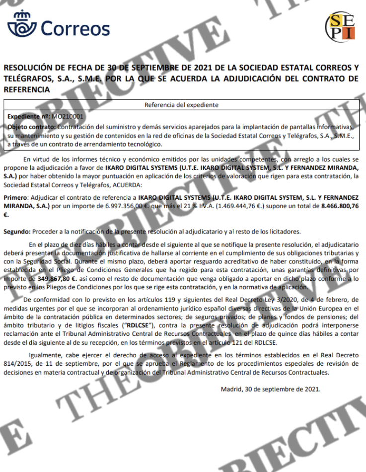 El impacto económico del renting se refuerza con la información obtenida por vía de Transparencia. En una resolución de acceso a la información pública requerida por THE OBJECTIVE, Correos aclara que no adquirió las pantallas, sino que las arrendó mediante un contrato de renting tecnológico, y que los equipos no han sido vendidos ni donados, permaneciendo ubicados en las oficinas. Al término del contrato, por tanto, las pantallas —pese a seguir siendo operativas— no generan retorno patrimonial alguno para la empresa pública.