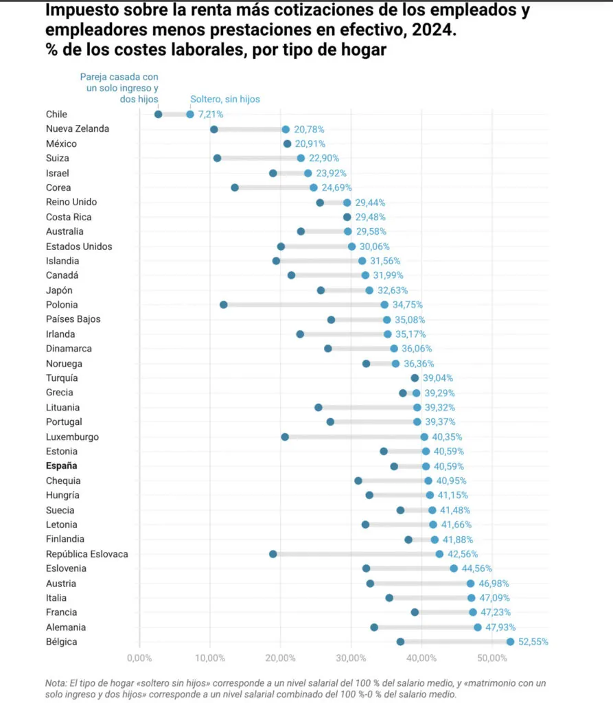 «Al ser el IRPF un impuesto progresivo, es técnicamente sencillo aplicar deducciones por hijos que ‘disminuyan’ la presión fiscal. En cambio —remarca Izquierdo—, las cotizaciones en España son porcentajes fijos destinados a financiar un sistema de pensiones bajo presión demográfica. Y, esta rigidez impide que la carga sobre las familias españolas (28,32%) se reduzca a niveles competitivos frente a la agilidad de los modelos nórdicos».