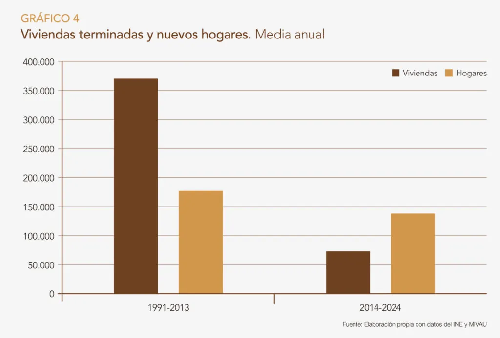Entre 1991 y 2013 se terminaron cada año un total de 370.362 viviendas de media (el 15% protegidas), mientras se creaban una media de 176.771 hogares al año. En la última década, entre 2014 y 2024, cada año se pusieron en el mercado una media de 73.067 nuevas viviendas, con una creación anual media de hogares de 137.208. Es decir, hemos pasado de construir 2,1 a 0,5 viviendas por hogar (Gráfico 4).