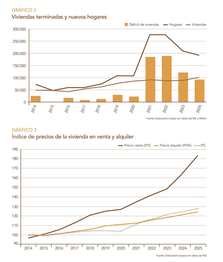 La brecha entre viviendas terminadas y creación neta de hogares –oferta y demanda de viviendas– se amplía a partir de 2020, generando un déficit de vivienda acumulado de 600.000 viviendas. En 2024 se pusieron en el mercado 100 980 viviendas nuevas frente a una demanda por creación de hogares de 195 001, con un aumento de la población de 508.602 personas, de las que 409 689 (80 %) fueron extranjeros. Es esta tensión entre una demanda creciente y una oferta insuficiente la que genera el incremento de precios tanto de compra como de alquiler (Gráfico 3). El futuro no es esperanzador: el INE estima que los hogares seguirán creciendo (una media de más de 320.000 nuevos hogares al año hasta 2030), triplicando la oferta actual de viviendas. Si no aumentamos la oferta, el déficit de viviendas y los precios seguirán subiendo.