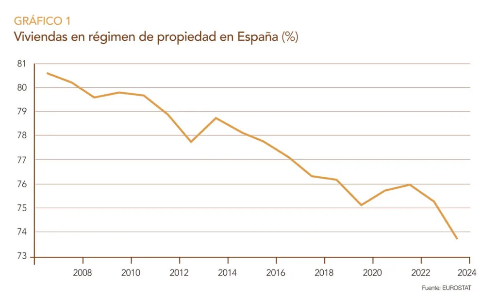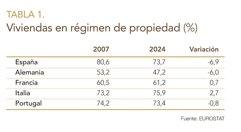 En menos de dos décadas, el porcentaje de viviendas en régimen de propiedad en España se ha reducido del 80,61% al 73,7%, 6,9 puntos porcentuales, según Eurostat (Gráfico 1). Es la mayor caída registrada entre los grandes países europeos (Tabla 1). Italia ya nos supera con un 75,9%. En este periodo se ha duplicado el número de familias viviendo en alquiler (o fórmulas análogas), pasando de 2,5 millones a 4,6 millones según el INE (2021) o hasta los 5,3 millones en cifras más recientes del Banco de España. Es el resultado del cambio en la política de vivienda, especialmente desde la llegada al poder de un gobierno social comunista, que ha permitido construir el relato político de grandes propietarios contra inquilinos y que hoy centra el discurso de la izquierda más radical.