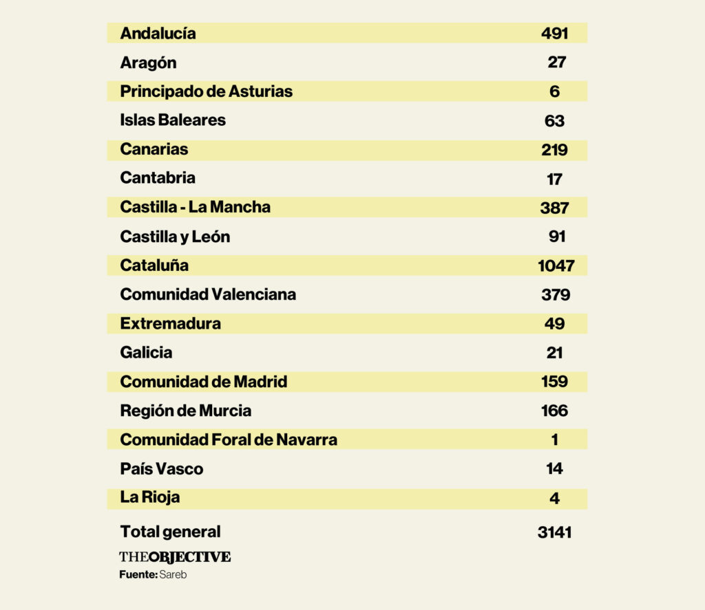 Esta empresa, dependiente del Ministerio de Vivienda, pretende ser el gran operador público nacional de vivienda en alquiler asequible. No una promotora clásica ni un ministerio encubierto, sino una empresa pública que gestiona viviendas a largo plazo, con criterios sociales y precios por debajo de mercado. Sin embargo, las viviendas okupadas no se han traspasadas a pesar de suponer una parte significativa del inventario heredado de la crisis inmobiliaria. Tras Cataluña, en volumen de viviendas de la Sareb okupadas se encuentran Andalucía con 491, Castilla-La Mancha con 387 y Comunidad Valenciana con 379, tal y como se puede apreciar en el cuadro inferior.