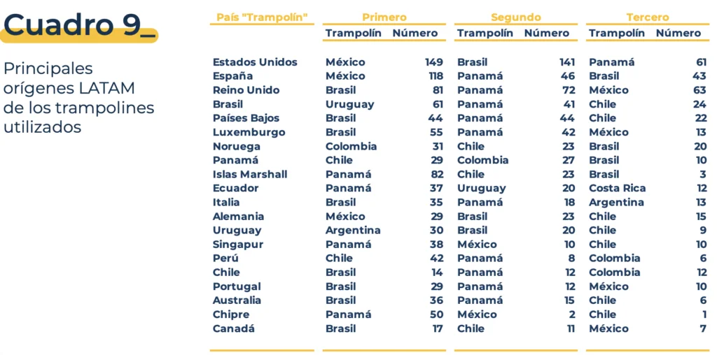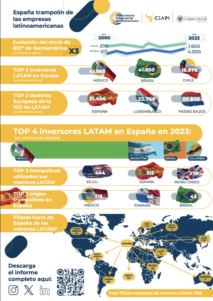 España es el segundo país del mundo, tras Estados Unidos, y el primero de Europa con mayor número de «empresas trampolín» de origen latinoamericano —ya sea de primer, segundo o tercer nivel—, entendidas como aquellas filiales desde las que se canalizan inversiones hacia terceros mercados.