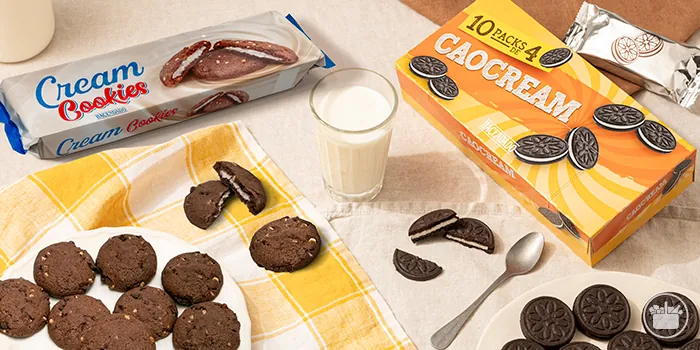 - Cream Cookies: galletas redondas de cacao rellenas de crema blanca.