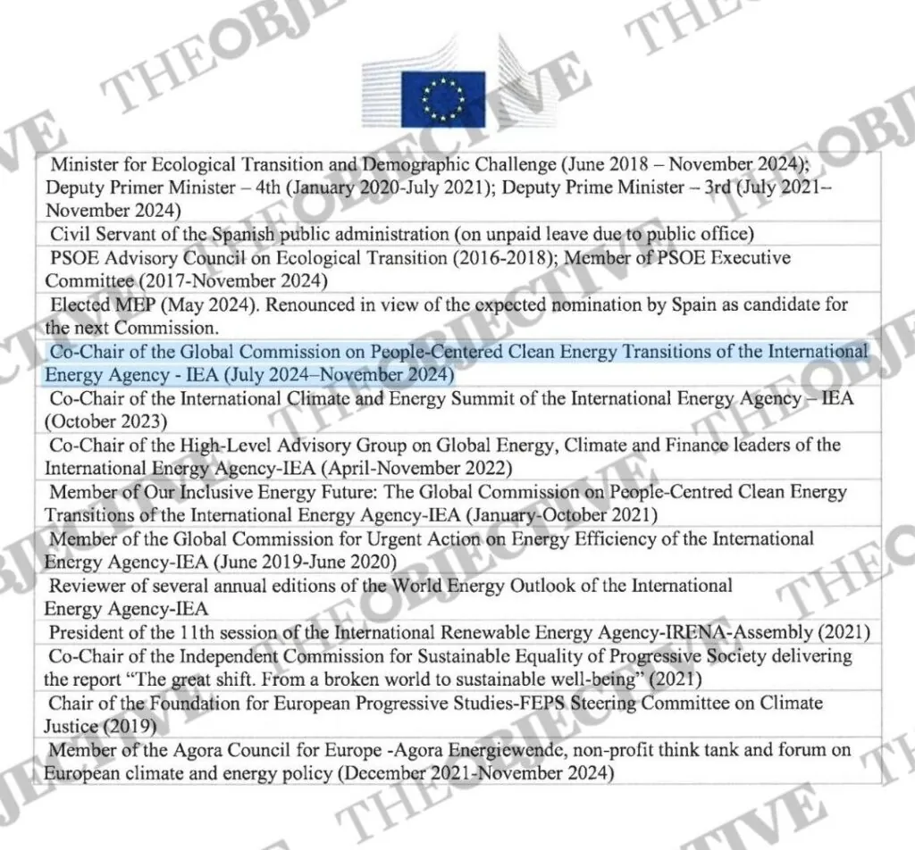 Fuentes oficiales de la AIE aseguran a THE OBJECTIVE que Ribera continúa copresidiendo el organismo desde julio de 2024, como se puede comprobar en la página web. Además, tras una reciente remodelación del equipo de esta comisión, la vicepresidenta de la Comisión Europea ha incluido entre sus miembros a la actual ministra de Transición Ecológica de España, Sara Aagesen. Por otro lado, se mantiene el comisario de Energía y Vivienda, Dan Jørgensen, que también llegó a ese puesto antes de ser nombrado por la Comisión, y que también incurre en ese conflicto de intereses.