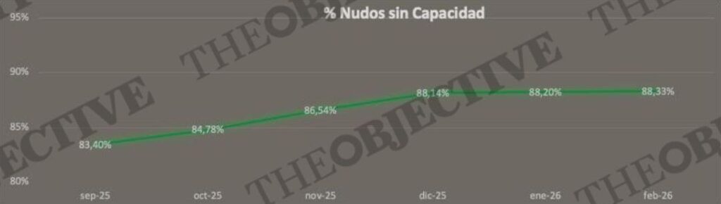 Este periódico publicó hace un mes el alarmante estado de la red eléctrica con un dato de enero de 2026 que señala que el 88,20% de los nudos están saturados. Un escenario que un mes después ha empeorado al aumentar el porcentaje hasta el 88,33%. La crudeza de este escenario queda mucho más clara si se observa un gráfico interno que manejan las eléctricas, en el que se aprecia que los nudos de la red sin capacidad han crecido en solo seis meses un cinco por ciento: del 83,4% al 88,3%.