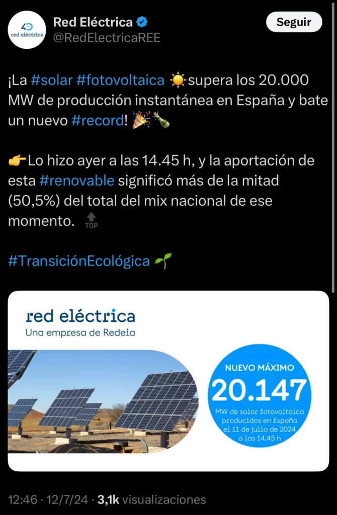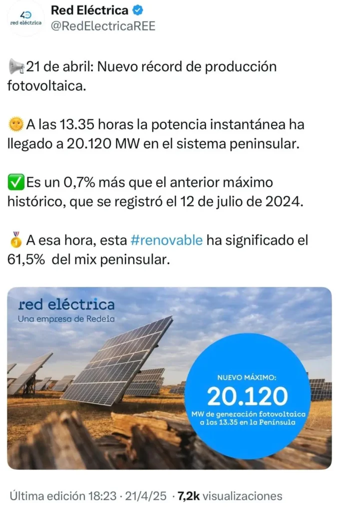 Prácticamente un año después, el 21 de abril de 2025, una semana exacta antes de que tuviera lugar en España el apagón, el gestor del sistema eléctrico presumió de llegar a su récord de producción fotovoltaica. «Nuevo récord de producción fotovoltaica», publicó en un tuit de la red social X. «A las 13.35, la potencia instantánea ha llegado a 20.120 megavatios en el sistema peninsular. Es un 0,7% más que el anterior máximo histórico, que se registró el 12 de julio de 2024. A esa hora, esta renovable ha significado el 61,5% del mix peninsular», concluía el mensaje, con el emoticono de una medalla de oro.