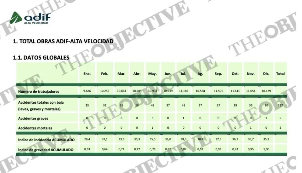 Un informe interno de la empresa ADIF Alta Velocidad al que ha tenido acceso THE OBJECTIVE muestra el riesgo laboral al que se enfrentan los trabajadores en las vías de alta velocidad. Durante el año 2025 ha habido dos muertos y 385 heridos en las obras públicas. Según el mismo documento, el índice de gravedad acumulado ha aumentado desde enero (que se situó en el 0,63) a diciembre (en el 1,00).