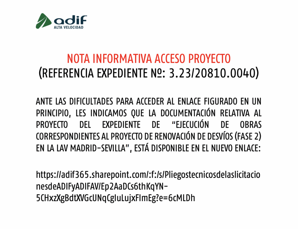 Por otra parte, en varios de los expedientes de obra que afectan al tramo de Adamuz, el repositorio de documentación pública asociado a estos proyectos muestra mensajes de error cuando se intenta acceder a información técnica sobre el alcance de las obras.