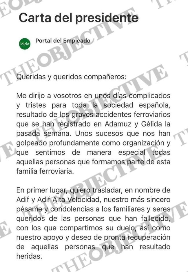 La carta, a la que ha tenido acceso THE OBJECTIVE, comienza así: «Me dirijo a vosotros en unos días complicados y tristes para toda la sociedad española, resultado de los graves accidentes ferroviarios que se han registrado en Adamuz y Gélida la pasada semana. Unos sucesos que nos han golpeado profundamente como organización y que sentimos de manera especial todas aquellas personas que formamos parte de esta familia ferroviaria».