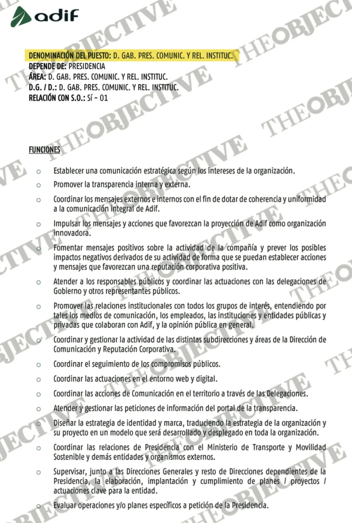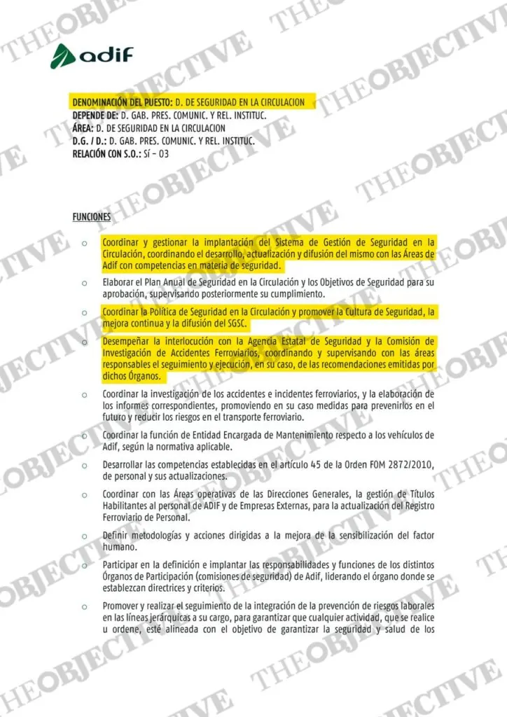 Según la información oficial de la compañía, entre las funciones de la dirección de gabinete de Presidencia, Comunicación y Relaciones Institucionales están las de «dirigir la supervisión y el cumplimiento del plan anual de seguridad en la circulación y los objetivos de seguridad» y «velar por que se cumpla el reglamento de evaluación y valoración del riesgo en vigor por parte de las áreas de su competencia que realicen cambios técnicos, de explotación u organizativos».
