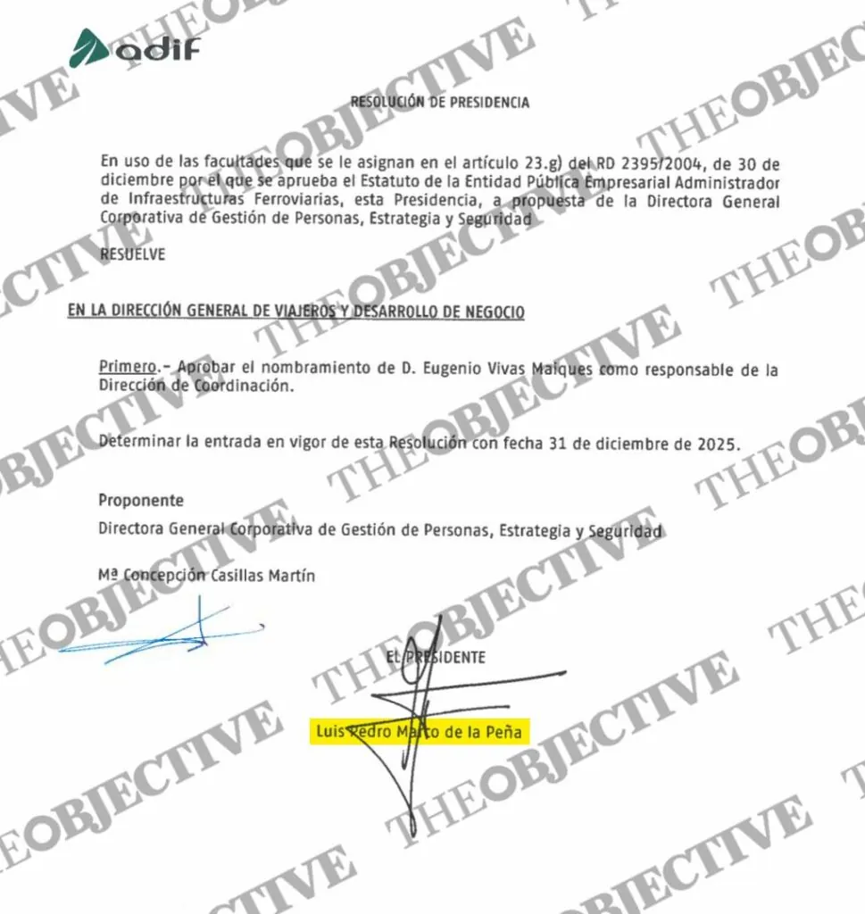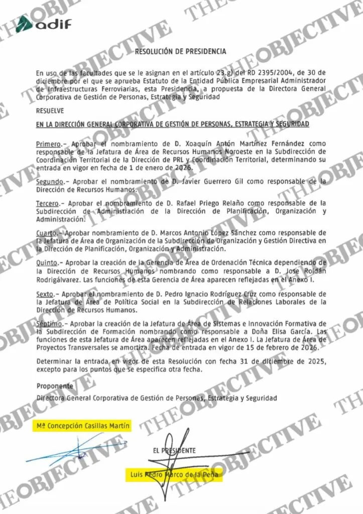 En los últimos años, la dirección de ADIF ha llevado a cabo una política de ocultismo que limita a sus trabajadores conocer los nombramientos que tienen lugar en la empresa, incluso cuando les afectan. THE OBJECTIVE ha accedido a documentos internos en los que se ven nombramientos firmados por la directora de Recursos Humanos, Concepción Casillas (Conchi, como es conocida en la empresa), y por el presidente de la empresa, Luis Pedro Marco de la Peña, a los que no ha tenido acceso el resto de la plantilla.