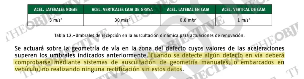 En cuanto a las labores que debería haber realizado ADIF (si se confirmase que no realizó ninguna), estas aparecen reflejadas en un documento técnico de ADIF con código NAV 7-1-3.7. En él, se especifica que todos los valores superiores a los normales (30 m/s) obligará a una «revisión mediante sistemas de auscultación de geometría manuales, o embarcados en vehículos, no realizando ninguna rectificación sin esos datos».