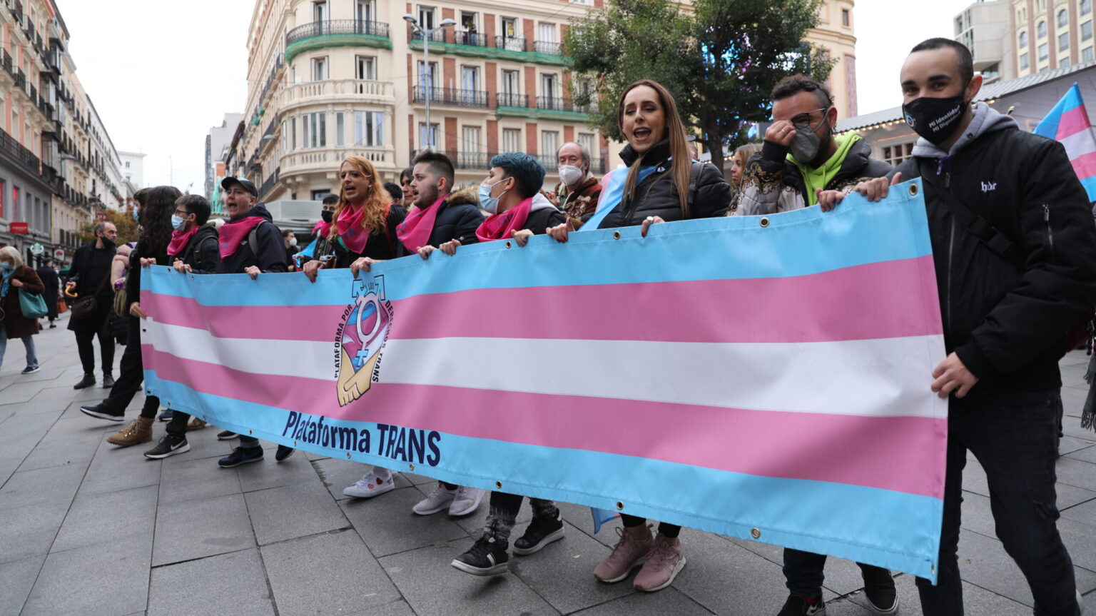 Varias personas sostienen una pancarta con el logo de la Plataforma Trans, en una manifestación. | Isabel Infantes