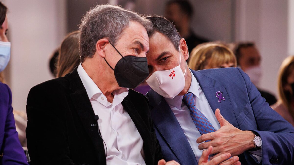 El presidente del Gobierno, Pedro Sánchez, charla con el expresidente José Luis Rodríguez Zapatero. | Europa Press
