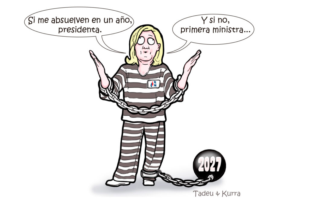 Ante tal conmoción, la Justicia, asustada probablemente por las reacciones, y quitándose la venda que nunca debería, ya ha anunciado que le hará un hueco en el verano de 2026 para ventilar su apelación: será el rien ne va plus de Le Pen. Si es absuelta, la vía real a las presidenciales; si no, el candidato será el joven Jordan Bardella, su hijo político y sobrino político (es pareja de su sobrina), y la estrella ascendente de la extrema derecha, que, si lograse alzarse con el triunfo nombraría a Le Pen como Primera ministra (la inhabilitación, incomprensiblemente, no es óbice para que ocupe este cargo, por no ser electo). A la espera de hacer un intercambio de roles a lo Putin-Medvedev en 2031.