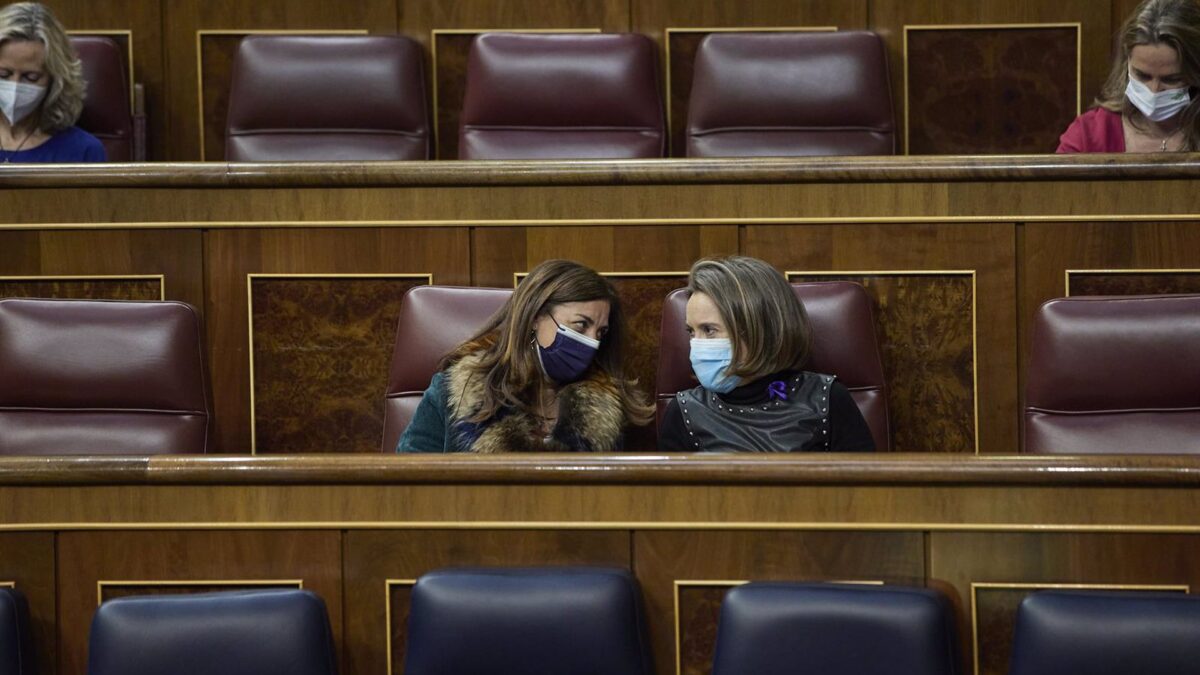 La portavoz del PP en el Congreso, Cuca Gamarra (d), charla con su portavoz de Industria, Tristana Moraleja. | Europa Press
