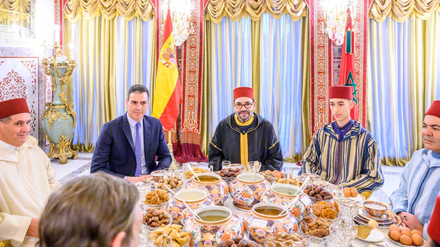 En la mesa (llena de sopa marroquí “harira”, dulces, huevos y dátiles entre otras cosas), Sánchez estaba sentado a la derecha de Mohamed VI, tal y como indica el protocolo, y a su lado estaba el presidente del Gobierno marroquí, Aziz Ajanuch, considerado amigo cercano del monarca.