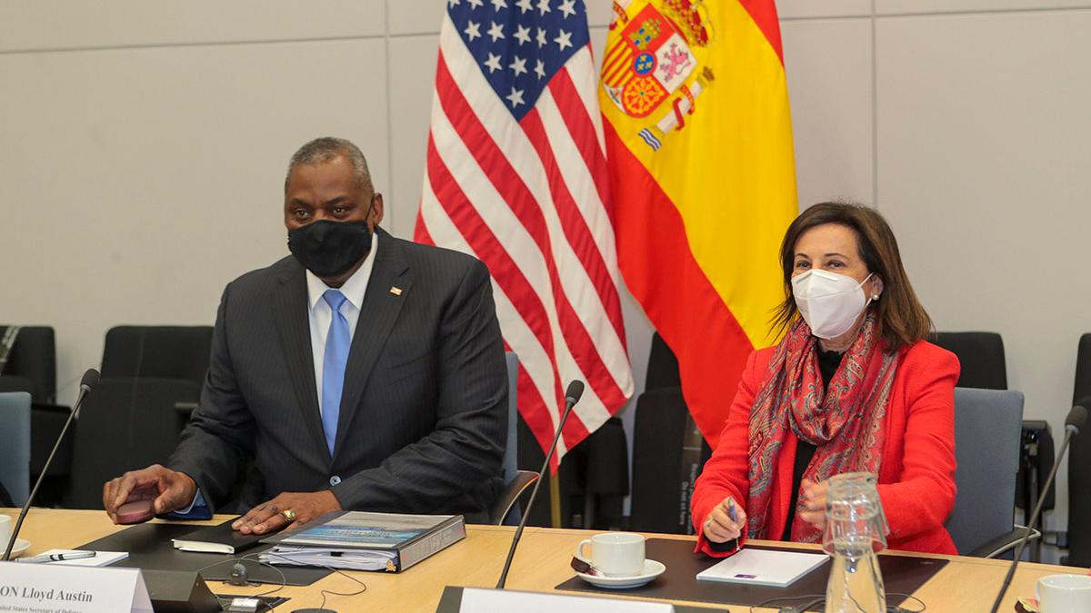 Margarita Robles celebra una reunión bilateral con el secretario de Defensa, Lloyd J. Austin, en octubre en Bruselas. | Foto: La Moncloa