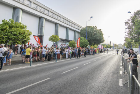 Trabajadores de la RTVA protestan a la llegada de los candidatos al debate. | Raúl Caro (EFE)