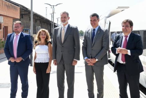 Tras esta intervención, el jefe del Ejecutivo acompañó al Rey Felipe VI en la inauguración del tramo Plasencia-Badajoz de la línea Madrid-Extremadura, compromiso monolítico de los sucesivos gobiernos de España, que refleja, según Moncloa, «el firme compromiso del Ejecutivo con el desarrollo ferroviario». Un compromiso verbal, pues Sánchez, habiendo terminado con este acto su agenda institucional, volvió en el Falcon presidencial hasta el Palacio de la Moncloa. El avión, que consume 1.313 litros de combustible por hora, partió de vacío desde Torrejón de Ardoz para recogerle en Extremadura y traerlo de vuelta al aeródromo madrileño.