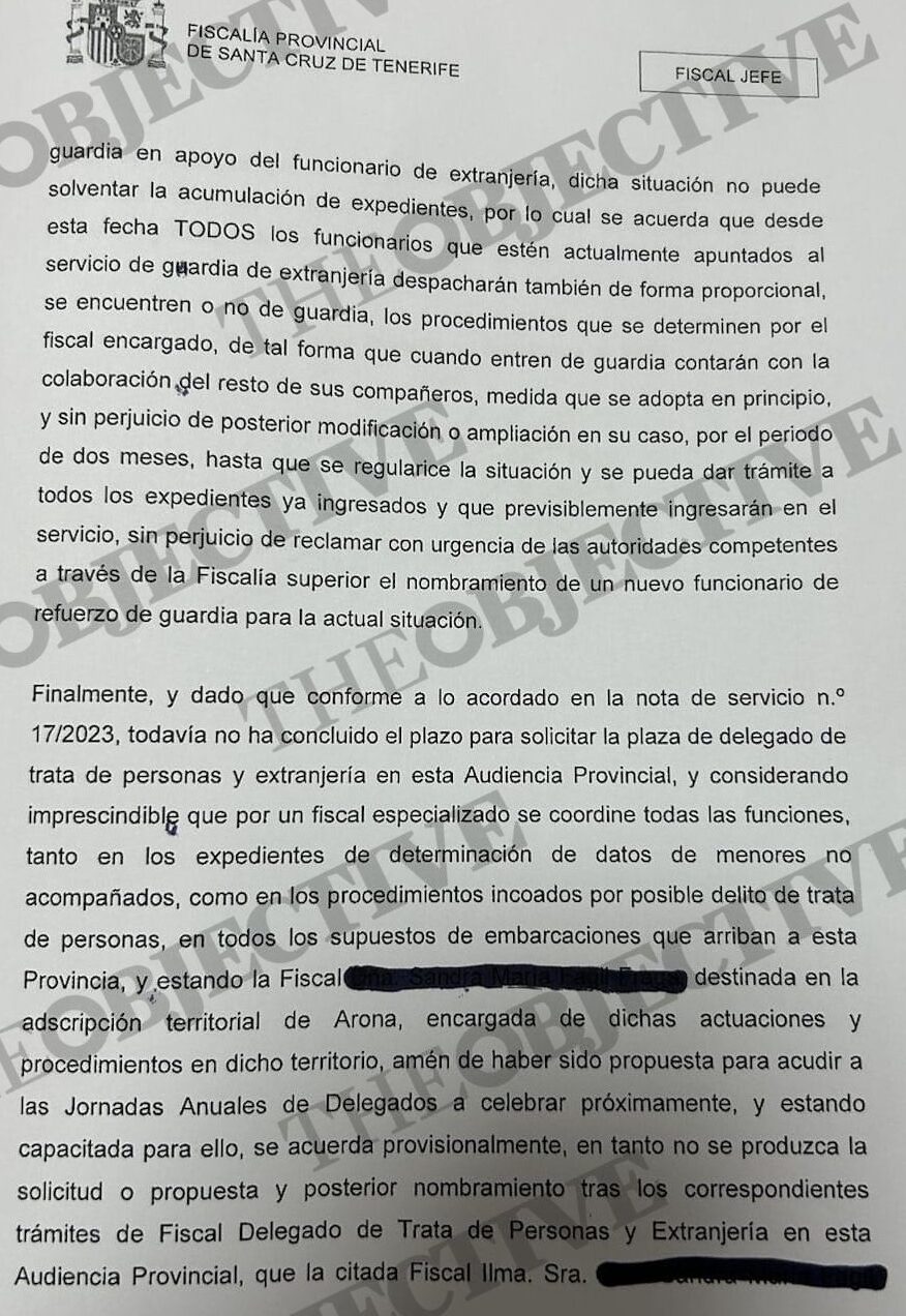 Como sustituto de esta última, con carácter interino, temporal y con plenos poderes, el fiscal jefe también nombra a un nuevo «fiscal encargado» durante el plazo de un mes a contar desde el pasado 13 de octubre. «Se acuerda que desde esta fecha TODOS (sic) los funcionarios que estén apuntados al turno de guardia de extranjería despacharán también de forma proporcional, se encuentren o no de guardia, los procedimientos que se determinen por el fiscal encargado, de tal forma que cuando entren de guardia contarán con la colaboración de todos sus compañeros», indica la orden del fiscal jefe de Tenerife.